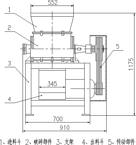 该机主要由:进料斗、破碎部件、支架、出料斗、传动部件等