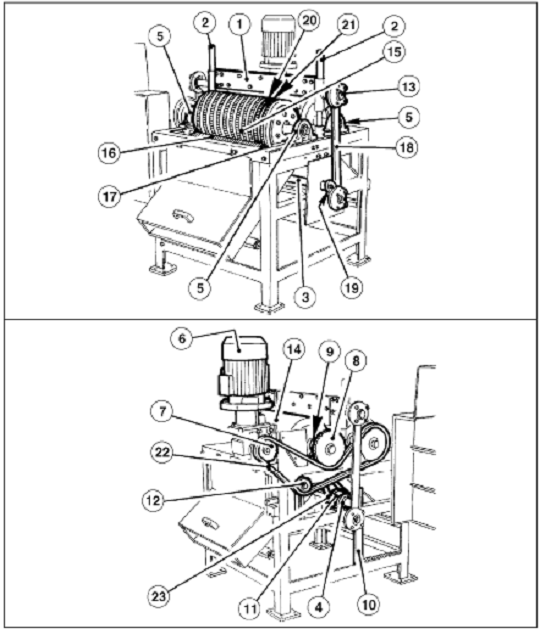 机器的拆卸, 首先拆去所有的给予保护的嵌板。接着移去电机和链条、链轮。拆下曲柄、胶辊、齿辊和梳子板,以及所有的电器材料及其它。所有的拆卸程序一定遵从操作,拆卸过程一定要熟练的操作员操作。
